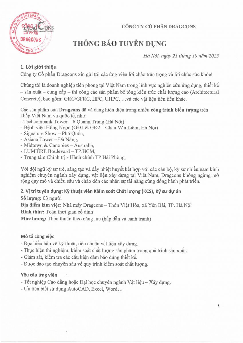 - [TUYỂN DỤNG] CÔNG TY CỔ PHẦN DRAGCONS