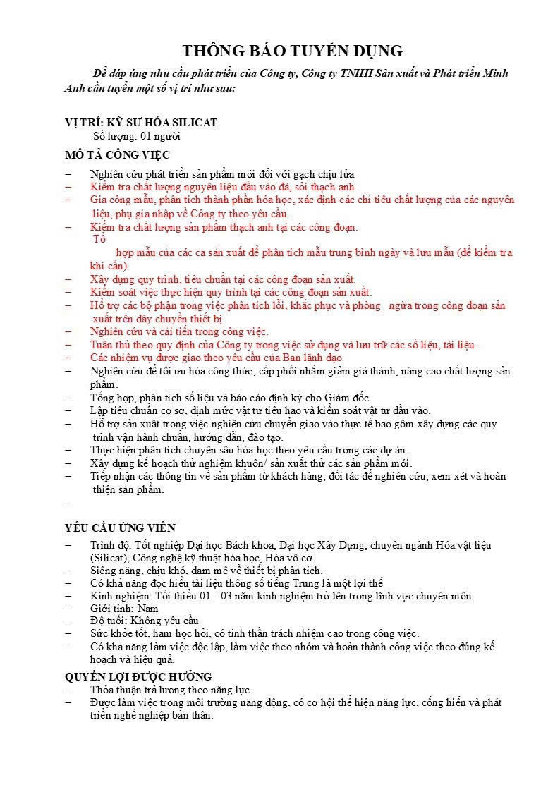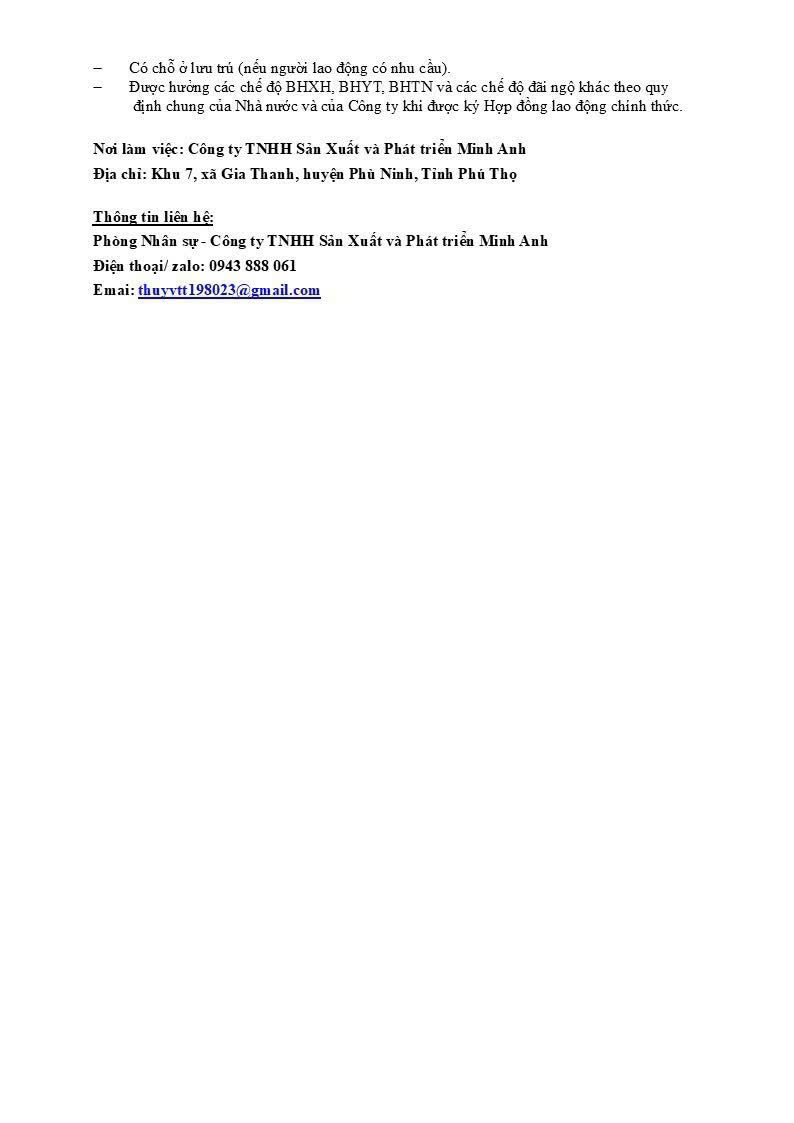 [TUYỂN DỤNG] CÔNG TY TNHH SẢN XUẤT VÀ PHÁT TRIỂN MINH ANH