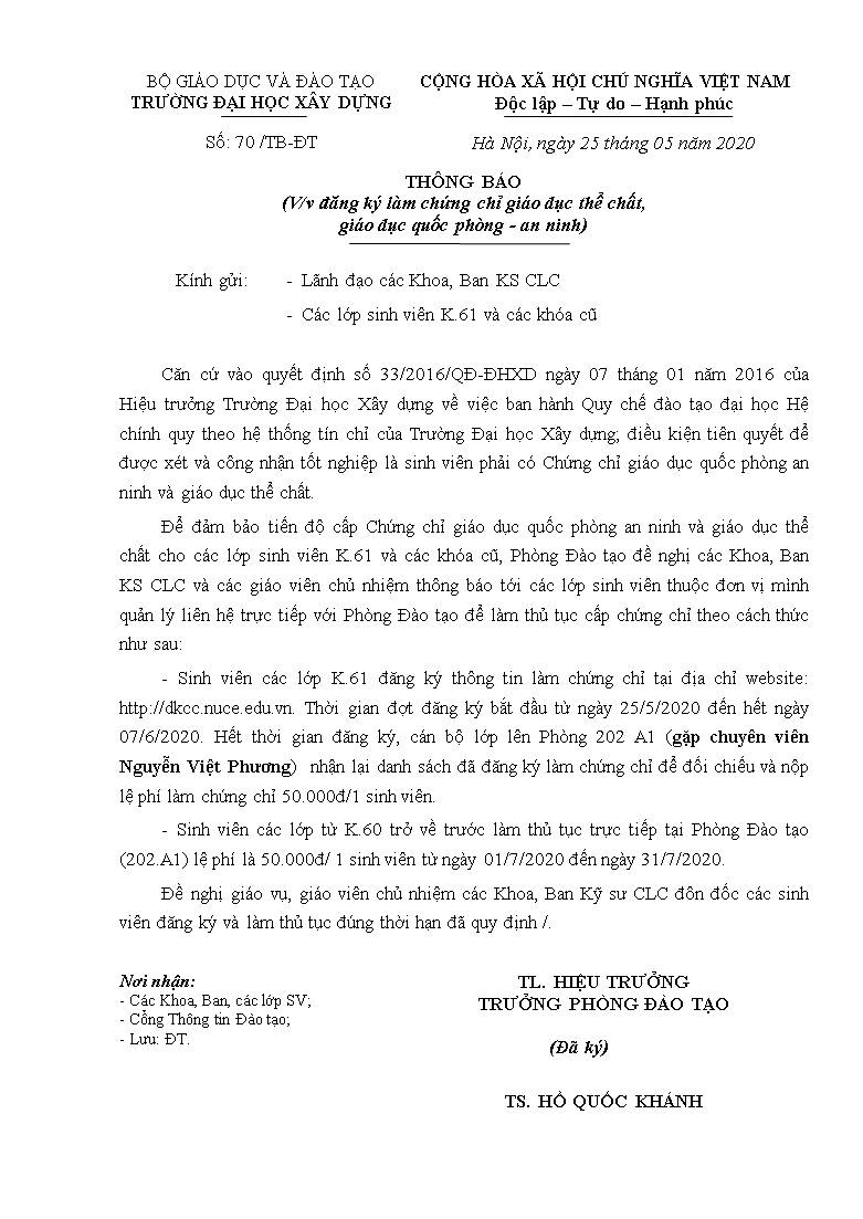 Thông báo đăng ký làm chứng chỉ giáo dục thể chất, giáo dục quốc phòng, an ninh cho các lớp sinh viên K61 và các khóa cũ