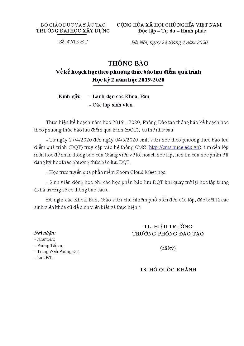 Theo thông báo số 47/TB-ĐT (23/4/2020) về kế hoạch học theo phương thức bảo lưu ĐQT kỳ II (2019/2020).