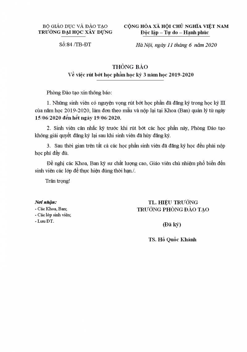 Thông báo về việc rút bớt học phần học kỳ 3 năm học 2019/2020