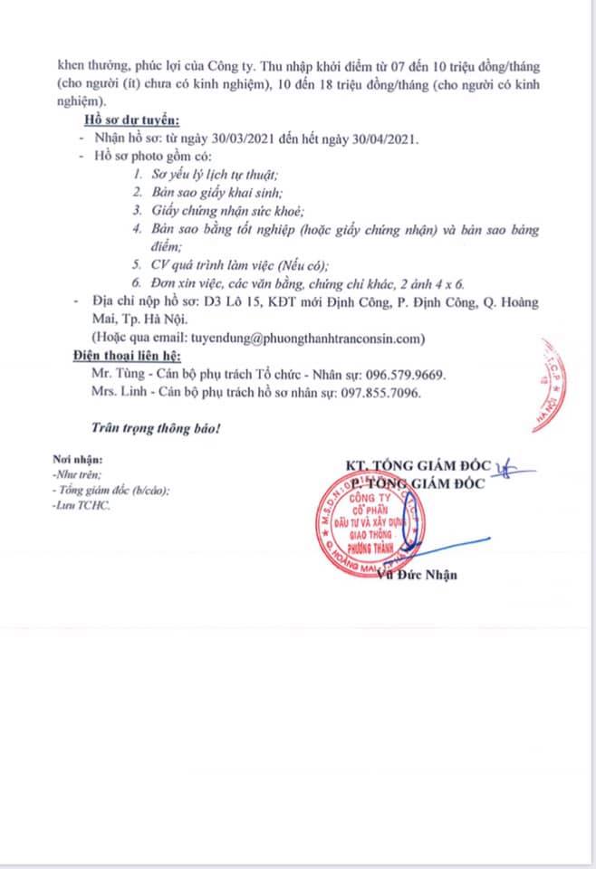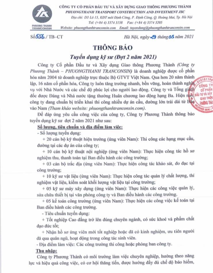 Tuyển 10 kỹ sư VLXD - Công ty CP và đầu tư và Xây dựng giao thông Phương Thành